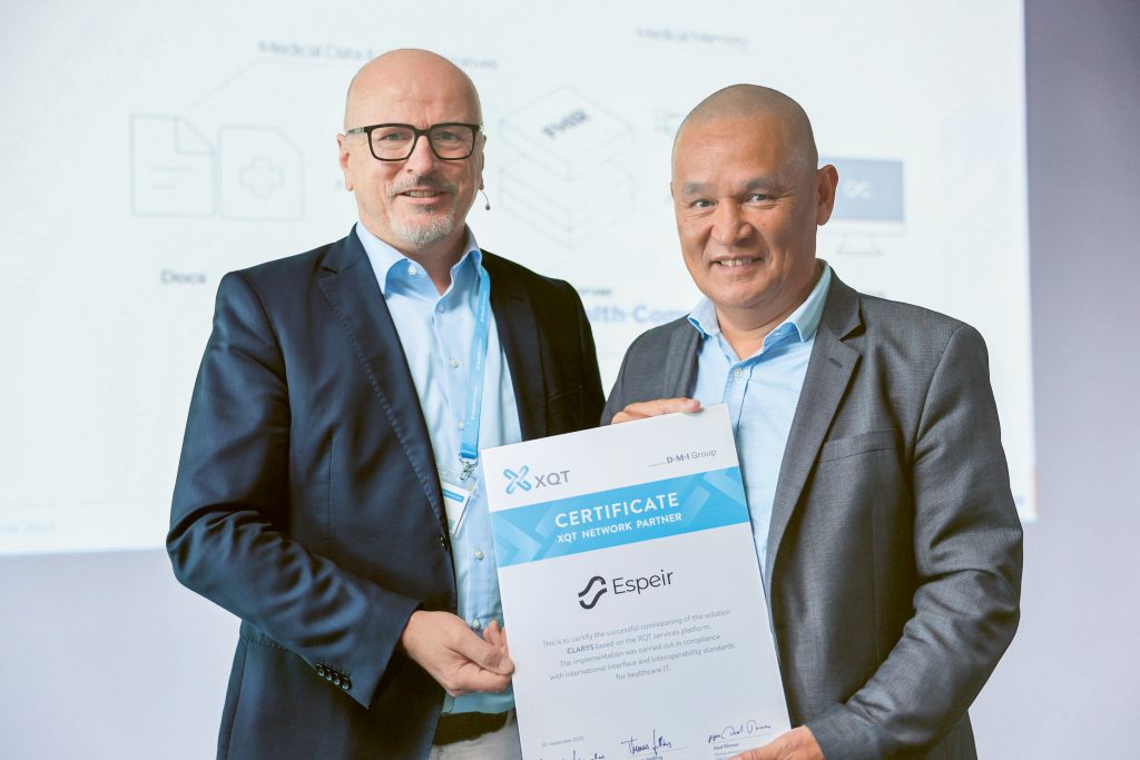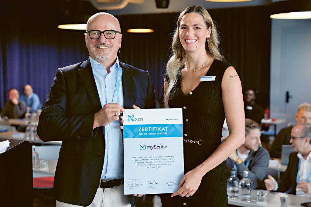 Am zweiten Tag des Anwendertreffens wurden myScribe und ESPEIR als XQT Network Partner ausgezeichnet. Stellvertretend nahmen Ira Stoll, Ärztin und Gründerin von myScribe und Lân Guichot, Vorsitzender und CEO, ESPEIR, diese Ehrung entgegen.